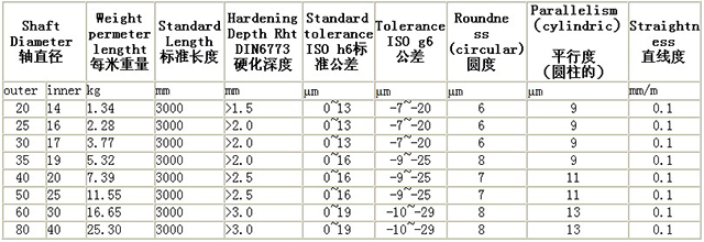 |  Induction hollow shaft 空心軸歸納  Chrome layer hardness=900-1100HV0.1 *By requrest for diameter 16mm up to we can offer max available length 5000mm **For: Standard tolerance ISO g6 根據(jù)要求,我們可以提供不在列表中直徑的特殊長度和公差尺寸的軸。 鍍鉻厚度:1.5-5絲 鉻層硬度:900-1100HV0.1 *根據(jù)要求,我們能夠提供直徑為16毫米的有效長度為5米 **標(biāo)準(zhǔn)公差I(lǐng)SO g6 | ||||