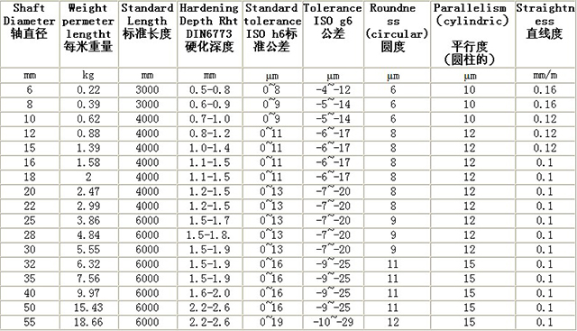 Chrome layer hardness=900-1100HV0.1 *By requrest for diameter 16mm up to we can offer max available length 5000mm **For: Standard tolerance ISO g6 根據(jù)要求,我們可以提供不在列表中直徑的特殊長度和公差尺寸的軸。 鍍鉻厚度:1.5-5絲 鉻層硬度:900-1100HV0.1 *根據(jù)要求,我們能夠提供直徑為16毫米的有效長度為5米 **標(biāo)準(zhǔn)公差I(lǐng)SO g6 | ||||